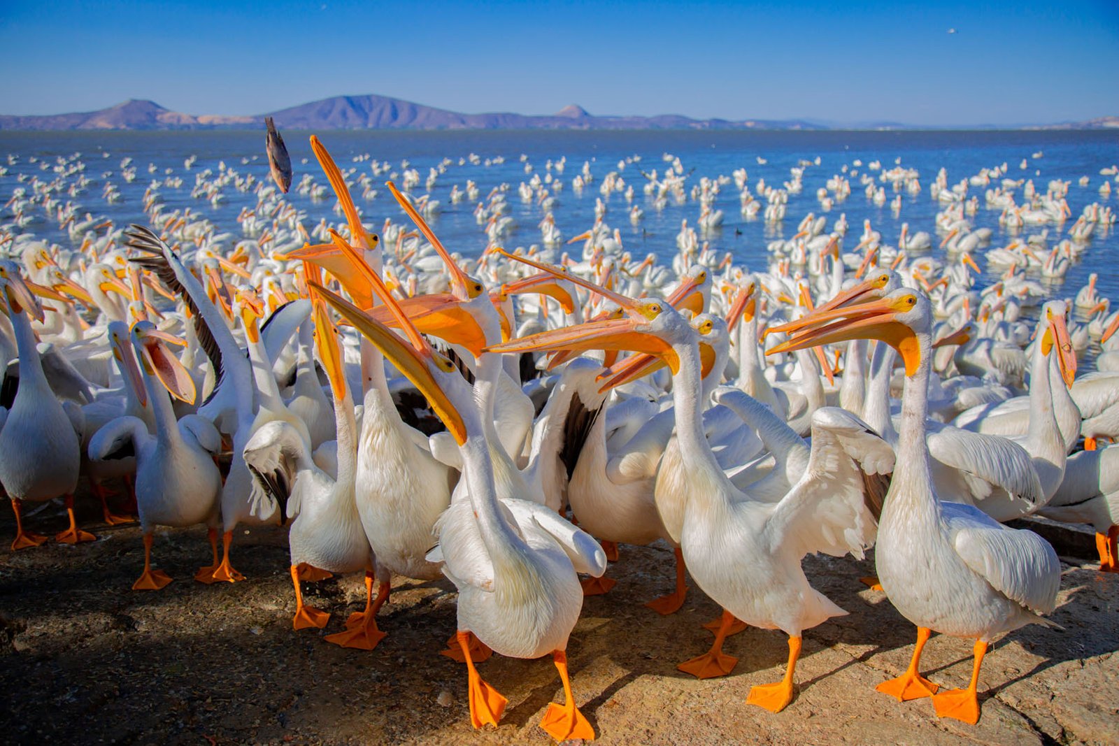 • Hay abundancia de peces en el Lago de Chapala, lo que les garantiza alimento suficiente. Las actividades de pesca y fileteado generan restos —espinas y vísceras— que se convierten en alimento para los pelícanos durante su estancia.